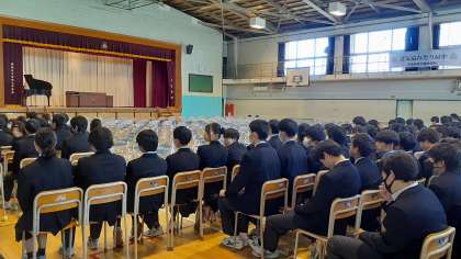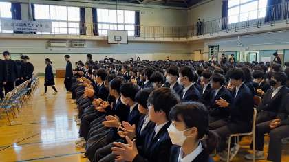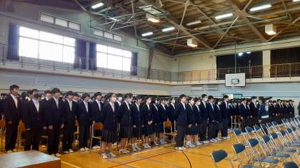 今日の三、四時間目は、卒業式の予行練習です。まず、一、二年生が着席して三年生を迎えます。校歌の練習もしています。卒業生が入場してきました。