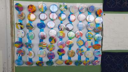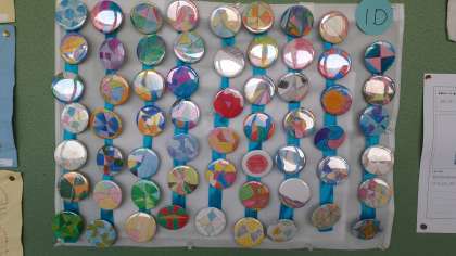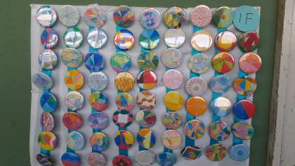 一年生の教室前の廊下に、美術の授業で制作した缶バッジを展示しています。一人2枚ずつ飾ってあります。模様と色合いがそれぞれ個性があります。是非ご覧ください。