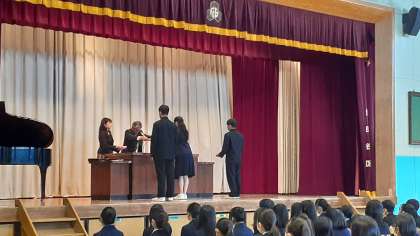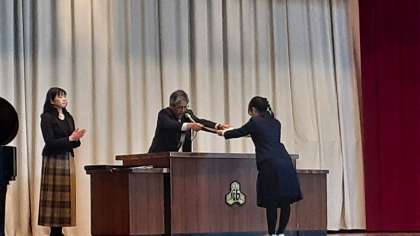 卒業式予行のあと、表彰がありました。まず、体育優良生徒、体育努力生徒が表彰されました。続いて、産業教育振興会優良生徒が表彰されました。