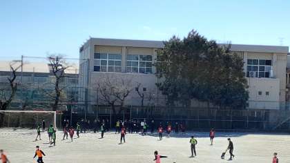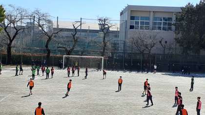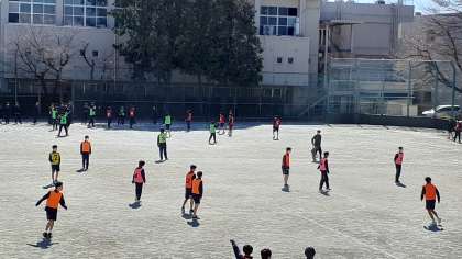 今日は二年生は球技大会です。前半は、男子が運動場でサッカーです。2面で試合をしています。