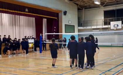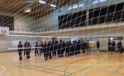 一年生球技大会、前半の女子は、体育館でバレーボールをしています。ちょうど試合が終わって挨拶をしていました。