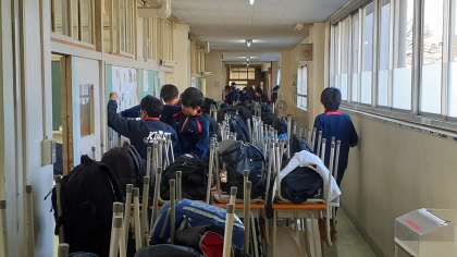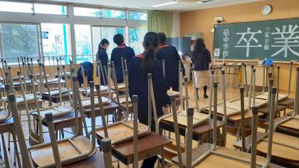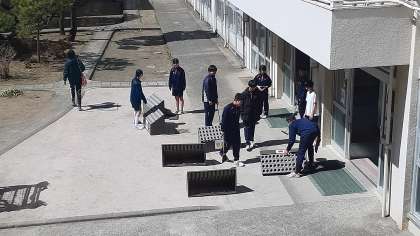二年生の四時間目は美化デーです。三年生の教室や、玄関など、分かれて清掃しています。教室は、一度全部の机を廊下に出してから清掃しています。