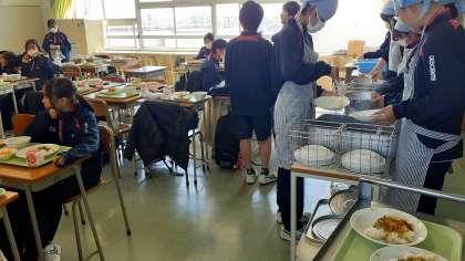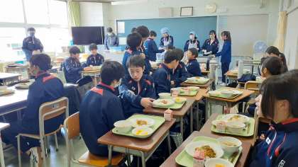 今年度最後の給食、一年生のクラスの様子です。まだ配膳中のクラスが多いですが、和やかな雰囲気が伝わってきます。一年間、美味しい給食をありがとうございました。