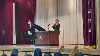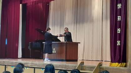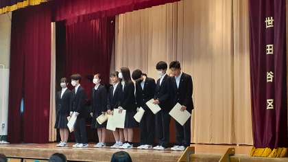 続いて、「社会を明るくする運動」作文コンテストの優秀作が表彰されました。そして、「明日の東京作文コンクール」の優秀作品、続いて「東京都書き初め紙上展」の準特選の生徒が壇上で表彰されました。