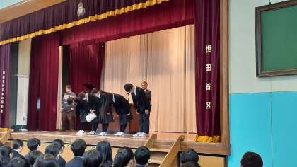 続いて、生徒会のクリスマスの飾りつけの活動が世田谷区より近隣地域と繋がる活動を評価されて表彰されました。次に、陸上部の子ども駅伝とロードレース大会の表彰、最後に吹奏楽部のアンサンブルコンテストの表彰がありました。