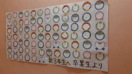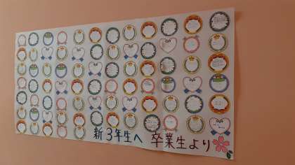 来週より新年度が始まります。三年生の教室への階段横の壁には、昨年度卒業生より新三年生へのメッセージが掲示してあります。是非立ち止まってご覧ください。