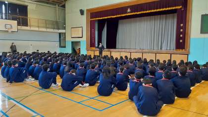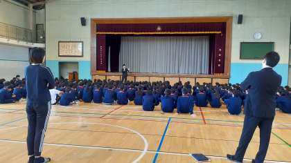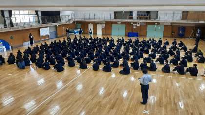 今日から3学年揃っての新年度が始まります。1、2年生の1時間目は格技室と体育館で、学年集会をしています。各学年の先生方から自己紹介や抱負などお話をしています。