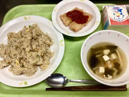 今日は中華です!給食でも大人気の「チャーハン」、2年前に初登場してから徐々に人気になっていった「いかチリソース」、わかめの塩気が効いてすっきりとした味わいの「わかめスープ」です!