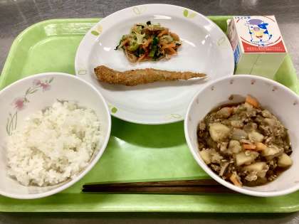 ししゃもはパン粉をまぶしてフライにしてあります。ししゃもなどのような骨ごと食べる「小魚」は、成長期の子供たちには欠かせない、貴重なカルシウム源です!そのため、給食でも小魚の摂取基準が設定されていますが、砧中では「ししゃもフライ」という料理を毎月出すことで、安定的に摂取量を確保することにしています。