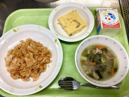 今日はチキンライスとオムレツです!給食でオムライスを作ることは難しいので、相性のいい料理を組み合わせることで再現しています。