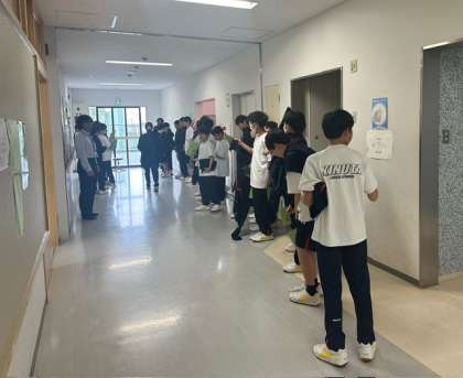 今日の午前中は、1年生の内科検診を実施しています。保健室前の検診を待っている様子です。