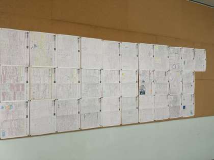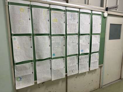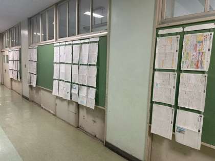 多目的ホールから家庭科被服室、調理室前の廊下に、3年生が2年生の最後に取り組んだ課題を掲示しています。食生活に関する課題を取り上げて、現状と解決策をSDGsと関連させた記事にして、新聞の形にまとめました。食品ロス問題や海の豊かさを守ろうなど、それぞれが分かりやすく工夫しています。どうぞご覧ください。