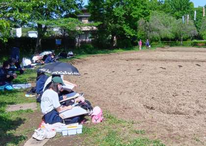 今年度最初の校外学習として、次大夫堀公園に写生会に来ています。この時期は鯉のぼりが飾られており、生徒はそれぞれ思い思いの場所に座って、クレヨンと水彩絵の具で風景を描きます。