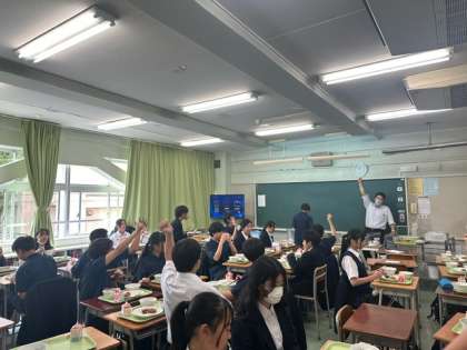 今日の給食はみんな大好きな鶏肉の唐揚げとわかめご飯です。配膳した後に、余った唐揚げをかけてのじゃんけん大会が各教室で見られました。