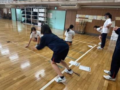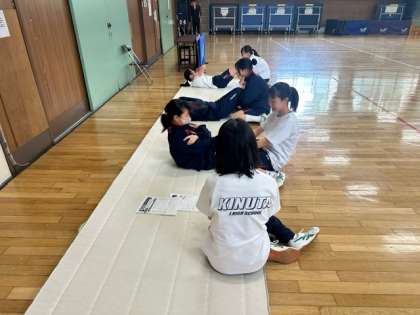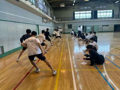 3年生の体育は体育館と格技室で体力テストをしています。ペアになって、男子が反復横跳び、女子が立ち幅跳びと上体起こしを計測をしています。