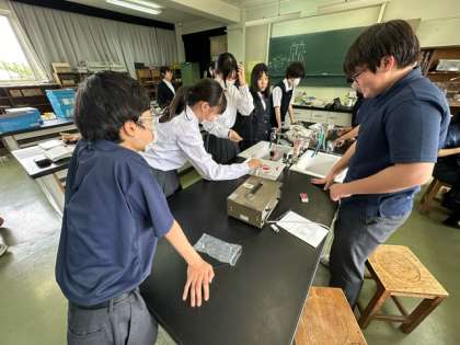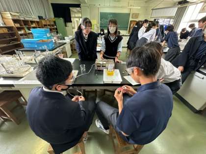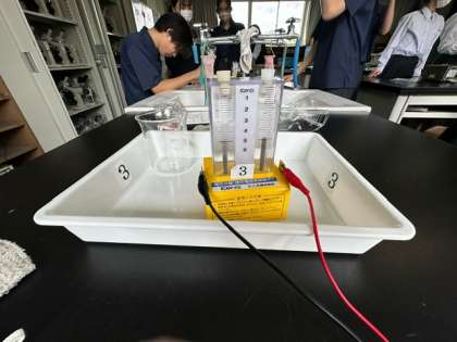 2年生の理科は理科室で実験をしています。班に分かれて「水の電気分解」をして結果を考察します。