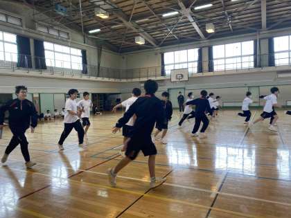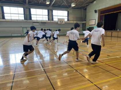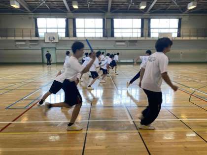 空模様が今ひとつなので、体育館でバトンパスの練習です。