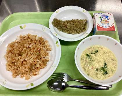 4月の給食では、「チキンライス」と「チーズオムレツ」を組み合わせて「オムライス風」にしました。今月はすでに「五目卵焼き」を別日に作ったことと、メインを魚料理にしたことで、スープの方に卵を使って「オムライス風」にしました。