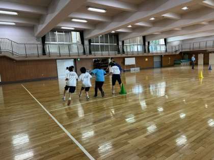 I 組も格技室で運動会の練習をしています。3年生が修学旅行の振替休日のため不在ですが、「台風の目」の回る練習をしています。