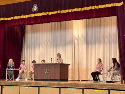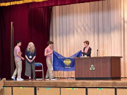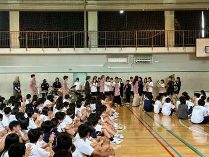 お昼休みの後、マウントテイバー校の歓迎セレモニーがありました。吹奏楽部の演奏と手拍子で出迎えました。そして、6名の来校生徒より自己紹介があり、オレゴン州の州旗をプレゼントしてくれました。