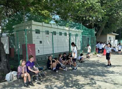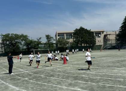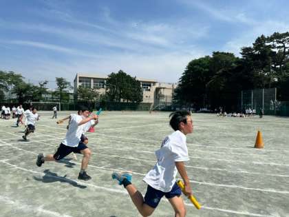 ?今日の5、6時間目は1年生が、運動会の学年練習をしています。選抜リレーの女子と男子の様子です。マウントテイバー校の生徒たちもこのあとの「台風の目」に参加する予定です。