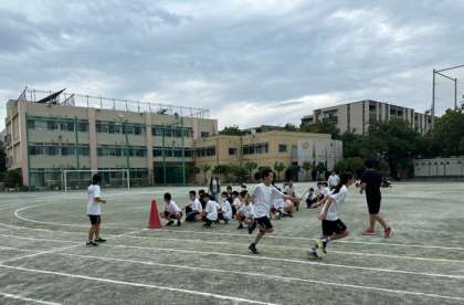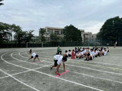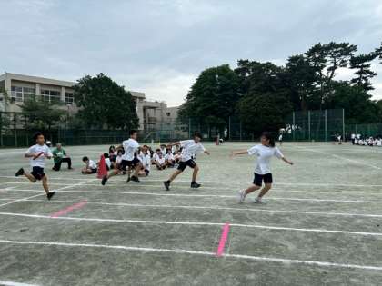 1年生AB組とI組が合同で運動会練習をしています。クラス対抗リレーの練習をしています。