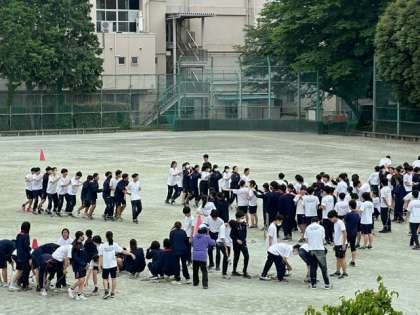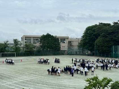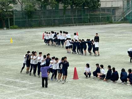 今日の3、4時間目は3年生の運動会学年練習です。「むかで」競走の練習をしているところです。