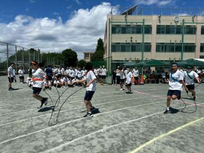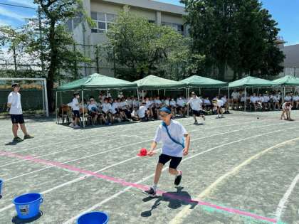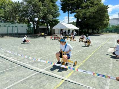 「山あり谷ありリレー」は1年生は全員練習します。縄跳び、網のトンネル、ボール運びと三輪車をリレーでつないで競います。まずは女子からです。