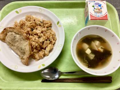 運動会に向けて、そんな生徒たちを応援したい!その気持ちを込めて、今日はキムチチャーハンとジャンボぎょうざ、わかめスープを作りました!どれも名前だけで楽しみになってくるメニューです。