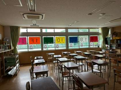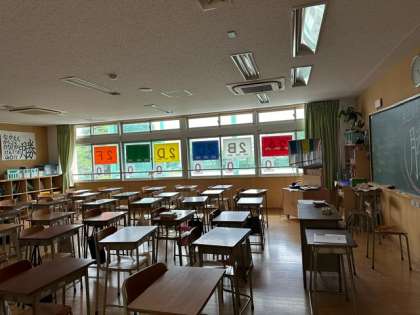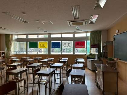 2階の3年生の教室の窓に、明日の運動会の得点板が貼ってあります。明日の得点・記録係が得点を掲示していきます。