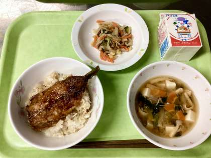 今日は6月4日で、「虫歯」の「む・し」にちなんで「虫歯予防デー」とされています。歯の健康のためには、しっかりとよく噛むことが大切です。さらによく噛むことで、脳への血行促進、アゴの力が強くなる、消化吸収を助けるなど様々な効果があります。そのため、今日は「イワシの蒲焼き丼」と「カミカミサラダ」、小松菜の入った「みそ汁」など、よく噛める料理を揃えました。といっても、イワシは油で揚げているので骨までやわらかくなっており、その他のメニューの野菜もしっかり茹でており、いつもどおり食べやすくなっているので、給食時間に支障は無いと思います。あとはみなさんが献立表を見て、噛むことを少し意識してもらえたなら嬉しいです!