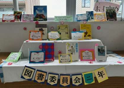 職員室横の廊下の移動図書館のスペースでは、月毎に図書委員会のお勧めの本を展示しています。6月は、2年生の図書委員会のお勧めの本です。借りることもできますので、どうぞご覧ください。