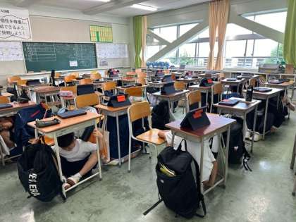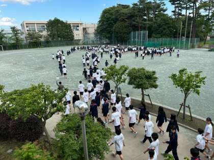 今日の6時間目に避難訓練がありました。地震の想定での避難訓練です。各教室でまず机の下で揺れが収まるのを待ち、運動場に避難します。