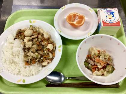 先週土曜日の運動会の給食で作った「豆腐とえびのうま煮」と似たような印象をもたれる方が、いるかもしれません。はい!そのとおりです!使っている材料も調味料も、とてもよく似ています!
