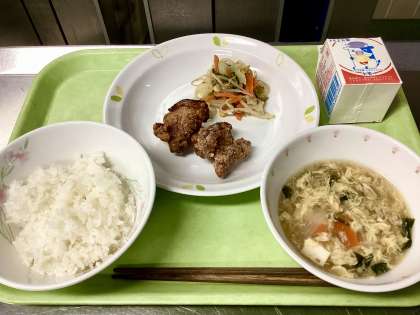 今日はお休みが多いクラスがありました。から揚げは問題ないとして、ご飯やサラダ、汁物は調整した方がいいと思い、毎朝お休みの数を調理員さんに伝えるようにしています。人数に合わせて、ていねいに対応してくれるのが、本当にありがたい!