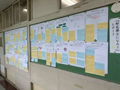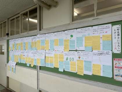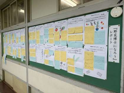 1年生のクラス前の廊下に、国語の授業で作成した「野菜博士になろう」というレポートを掲示しています。各自、一つ野菜を選んで、調べ学習をしています。どうぞご覧ください。