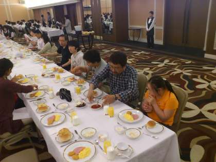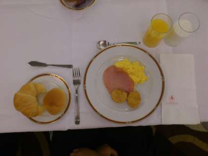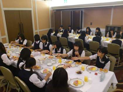 朝食のメニューは、バターロールとクロワッサン、スクランブルエッグにハム、サラダとフルーツヨーグルトに牛乳とオレンジジュースでした。I組も一緒に食事をとっています。