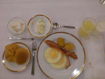 今朝のメニューは、バターロールにクロワッサン、フライドエッグにカリカリベーコン、ポテトサラダとフルーツヨーグルト。ジュースはグレープフルーツでした。