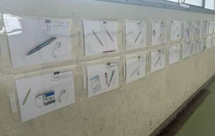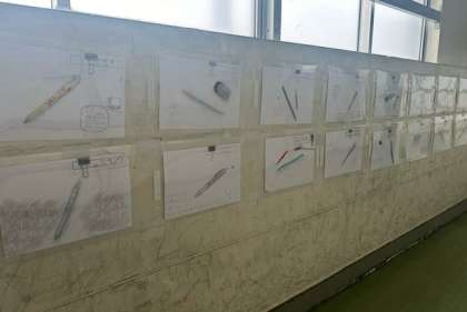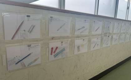 1年生のクラス前の廊下に、美術で制作した作品を掲示しています。「見つめると見えてくるもの」という題で、文房具のスケッチをしました。