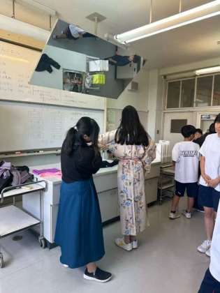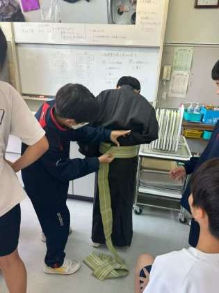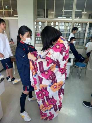 1年生の家庭科では、浴衣の着方を練習しています。着方を習ったあと、お互いに助け合いながら自分たちで着ます。