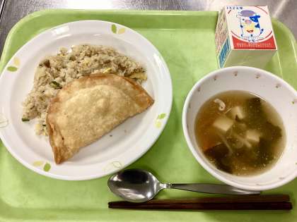 今日はチャーハンです。4月に出した時はそのボリュームからか、少し多めに残ったクラスもあったので、今日は卵の量を減らし、塩の量を増やして、味をよりはっきりさせるようにしました。給食として、そしておかずと合わせる「主食」としては、薄味で美味しく食べられる方向で考えるべきですが、この暑い季節においては、単純に塩分を増やして食べやすくした方がいいと思いました。ちなみに、わかめスープも今年度に入ってから「味が薄い」「残菜が増えた」と感じたので、今日は塩・こしょうを増やしてみました。とても美味しかったのと、この季節に合っていて食べやすいと思う仕上がりでした!