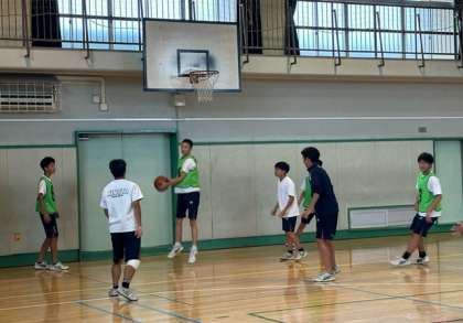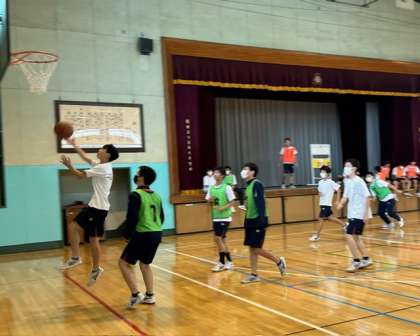 3年生体育男子は体育館でバスケットボールをしています。