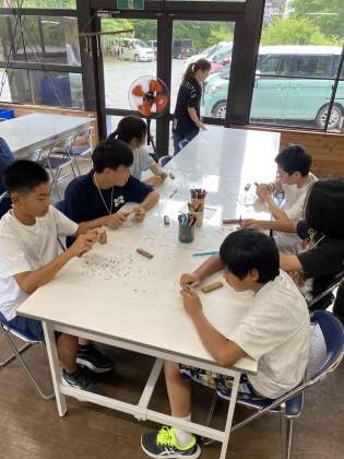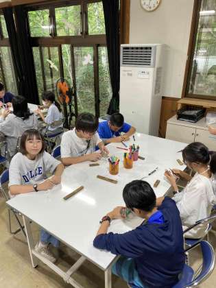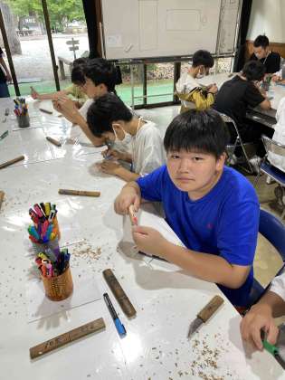こちらのグループは切り出し刀を使って、バードコールに絵付けをしてます。