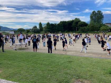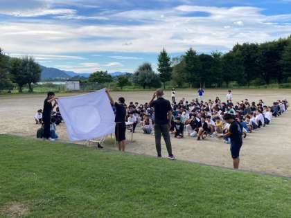 ラジオ体操の音楽がかからないアクシデントもありましたが、みんなで掛け声をかけていました。その後、シーツの片付け方について説明を聞きました。
