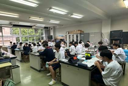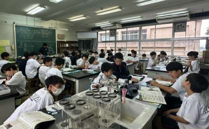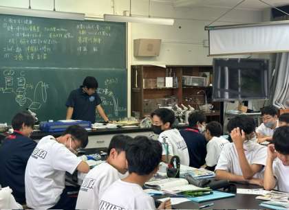 今日の1年生の体育男子は、理科室で保健体育の授業です。食生活と健康について学習しています。