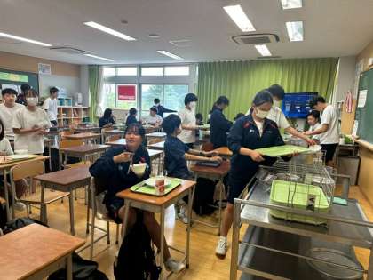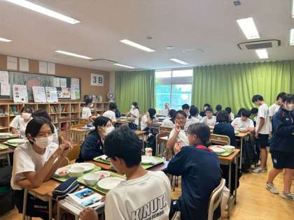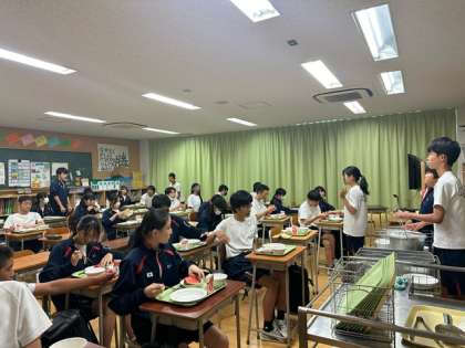 今日の給食は豆腐と野菜のピリ辛あんかけ丼、サラダとデザートにスイカです。3年生の給食と片付けの様子です。