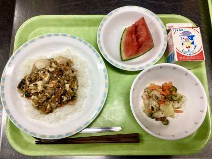 この日のメインは、「豆腐と野菜のピリ辛あんかけ丼」です。「マーボー豆腐」のような「豆腐を大量に使うメニュー」が禁止されている7月においては、大豆製品をはじめ、魚介類・うずら卵・野菜などの栄養をバランスよくとれる貴重なメニューです。これまでの実施を踏まえて、トウバンジャンの量も調整し、そこそこよく食べてくれるメニューになりました。
