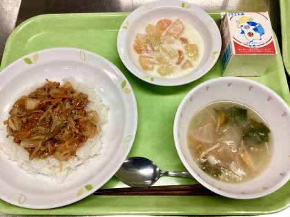 いよいよ今日が1学期最後の給食です!最後の日は「料理名を聞いただけでも元気になってほしい!」と思い、大人気の豚キムチ丼と、スープ・デザートの組み合わせにしました!今週は「曇りのち雨」といった天気が続き、暑さも落ち着いた日々が続きましたが、今日は久々に暑さを感じます。そのため、食欲が湧いてくるように「キムチの辛味」と「スープのごま油と生姜」の風味を効かせました!