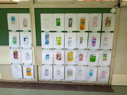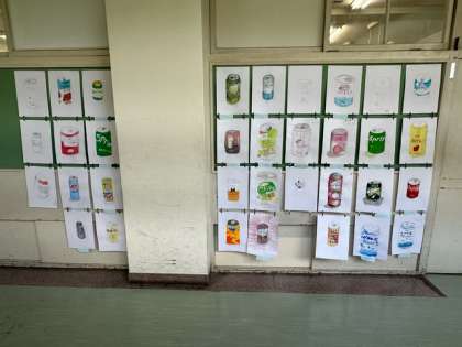 2年生の教室前の廊下に、美術で制作した淡彩画の「缶スケッチ」を掲示しています。どうぞご覧ください。