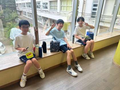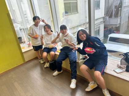 吹奏楽部は、多目的ホールでお弁当を食べているところです。